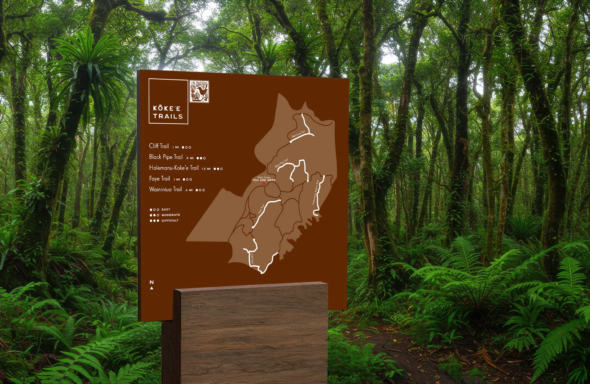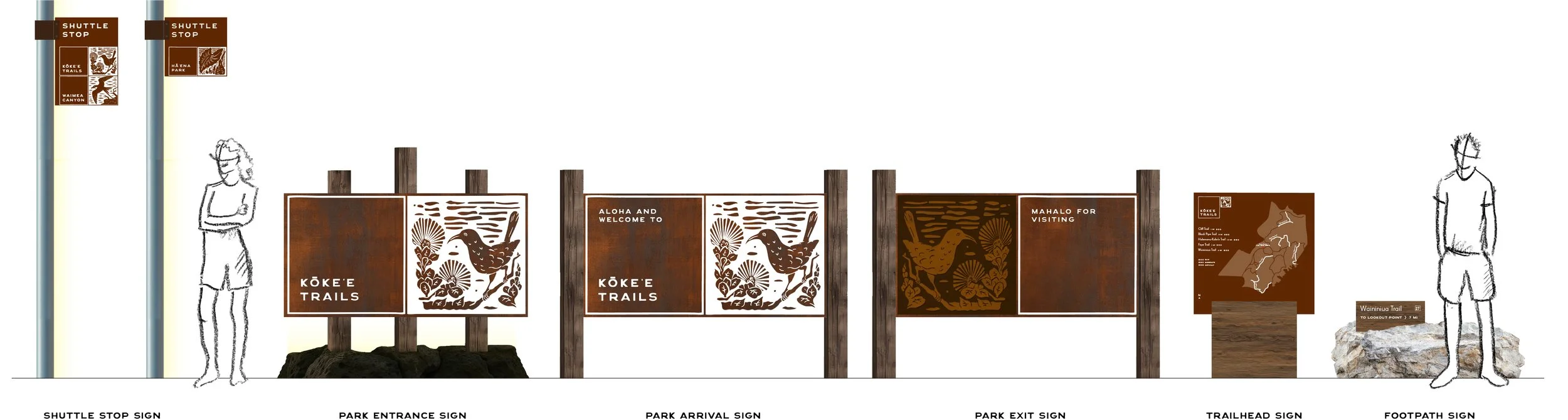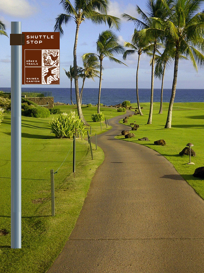 Crafted from resilient, natural materials, the signage system reflects Kaua‘i’s enduring spirit. Designed to adapt seamlessly across shuttle stops, entrances, and trails, each sign blends into the landscape as if it has always belonged there.